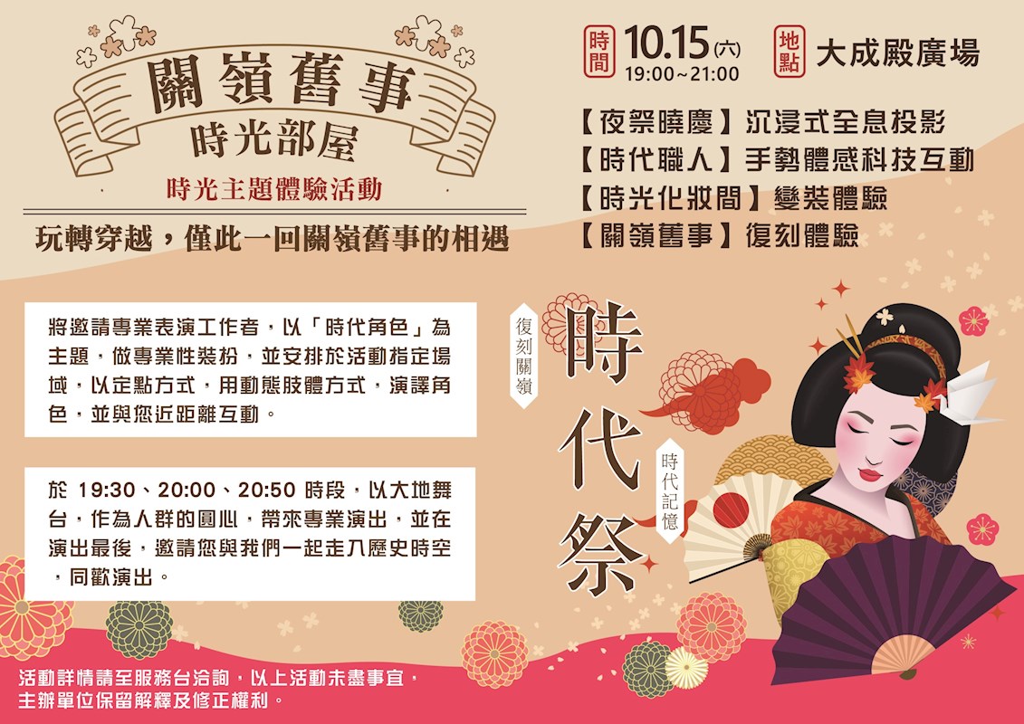 ▼10/15日「夜祭曉慶、時代職人、時光化妝間、關嶺舊事」等主題活動,可直接於現場參加,也都是免費體驗喔!
