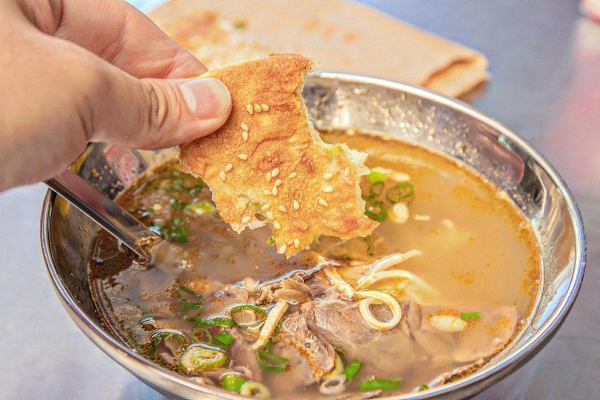 這間以老麵麵點為主的「麵鄉 安徽淮南牛肉湯」,湯頭類似清燉,不油味道卻十分足夠,超大一碗的牛肉湯只要80元,裡面不僅有薄片牛肉,還會加入豆乾絲,吸附湯汁的豆乾絲吃起來特別又好吃,而超大一片的燒餅也只要25元,又大又圓的香蔥燒餅,外層口感脆口內裏鬆軟,內餡滿滿的蔥花味道有點類似放大版的蟹殼黃,鹹香蔥香味十足,重點是吃起來完全不吃油不油膩,除了單吃餅外也可以沾點牛肉湯來吃都很合適,這樣兩個組合餐只要100元,湯還可以免費續真的很讚。