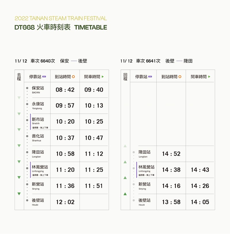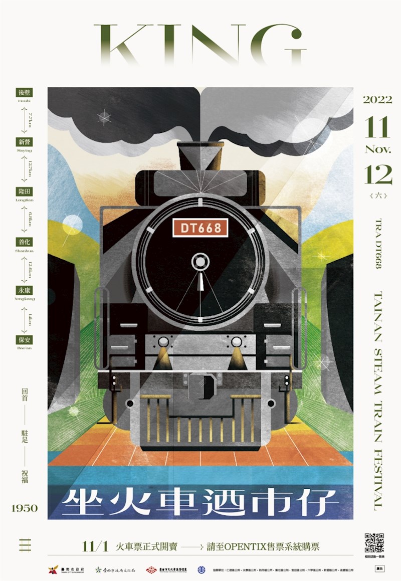 台南舉辦「2022坐火車迺市仔」活動,有「蒸汽火車之王」美譽的DT668國王號,將於今年11/12日重返台南,從保安站出發,沿途停靠永康、新市、善化、隆田、林鳳營、新營、後壁等車站,粉絲們可購買任一停靠站的班次上車體驗,部分車站還推出系列活動慶祝車票將在11月1日中午12點起開賣,鐵道迷們可千萬別錯過囉!