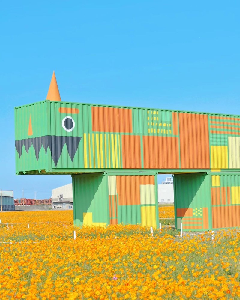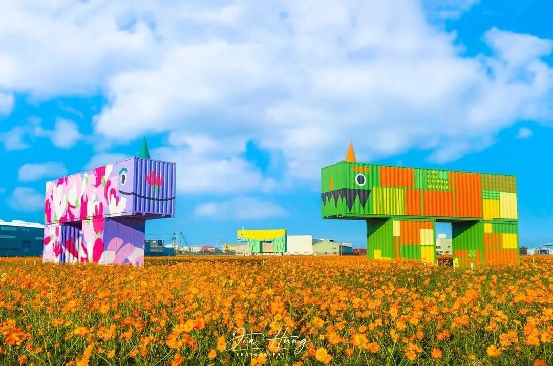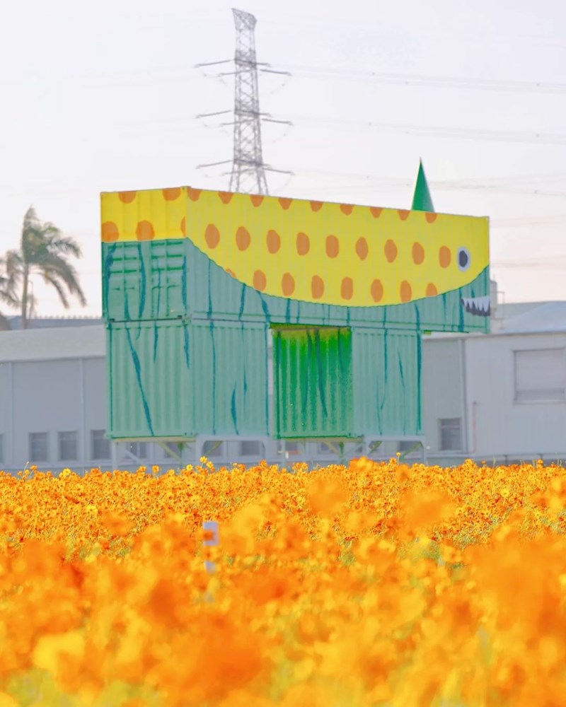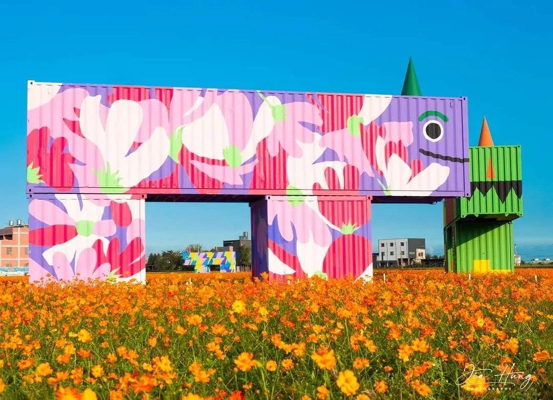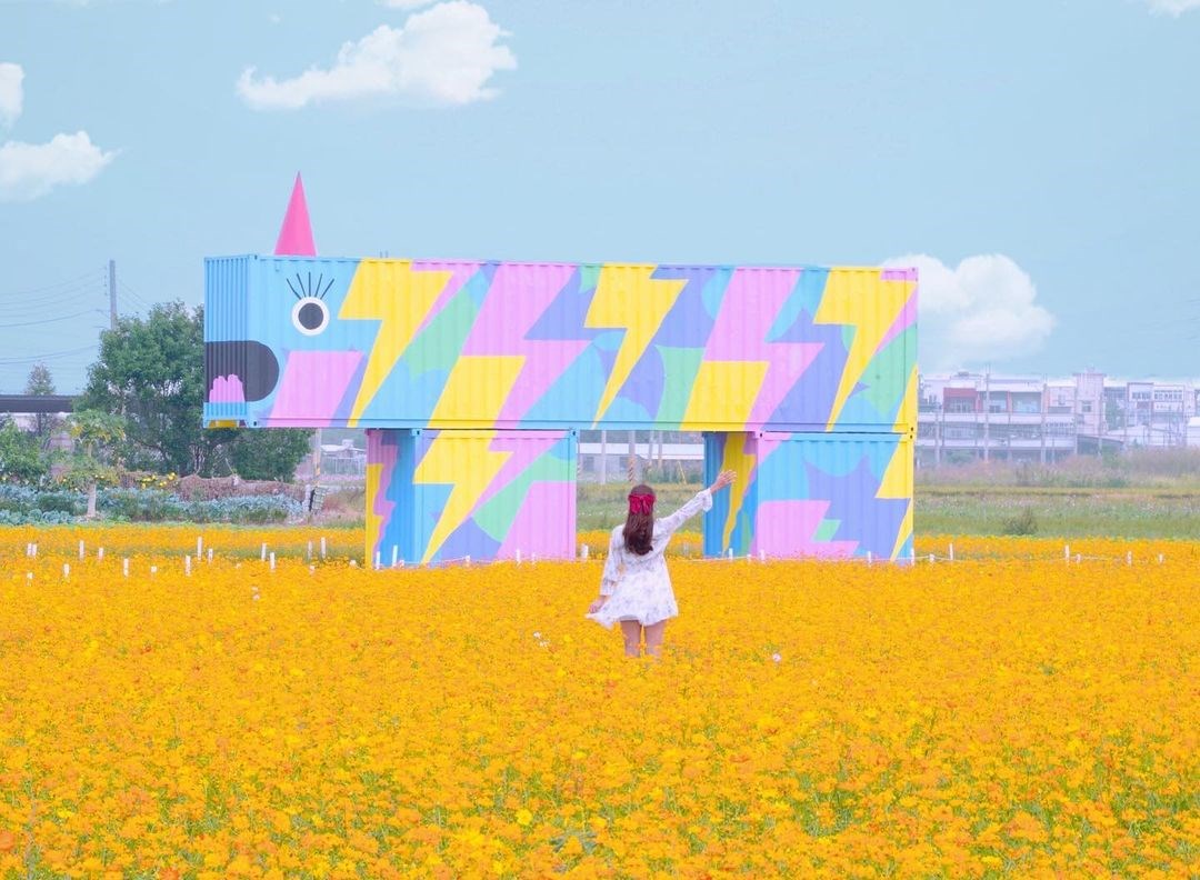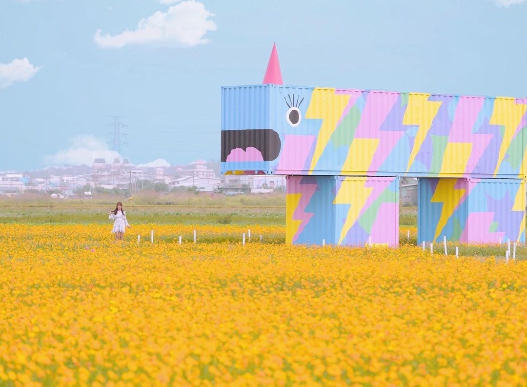 一望無際的金黃波斯菊花海隨風搖曳,搭上翠綠田野圍繞,畫面美不剩收,這次共有「赤山獸-井潤千畝 、花田獸-植妍花韻 、電力獸-龍躍百年、小玉獸 - 瓜瓞綿綿」四款由貨櫃屋組成的繽紛怪獸,搭配花海拍起也是相當吸睛,旁邊也有規劃參觀步道,粉絲們可以沿著小徑漫步花海,採用借位拍照就很有意境,請勿踩進花海中。