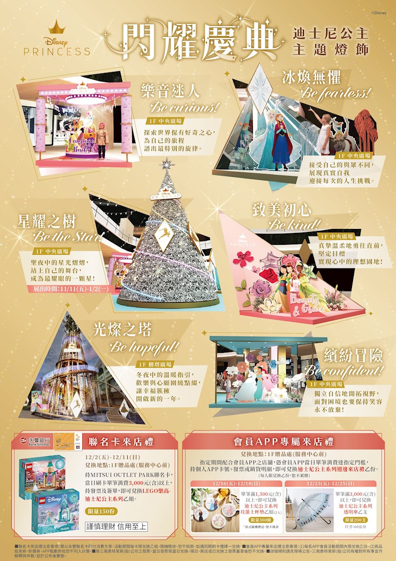 一年一度的聖誕節即將來臨,「Mitsui Outlet Park 台南」於中庭打造,4座迪士尼公主主題打卡,還有7米高聖誕樹閃耀登場,粉絲們可以準備出發,拍美照打卡囉!