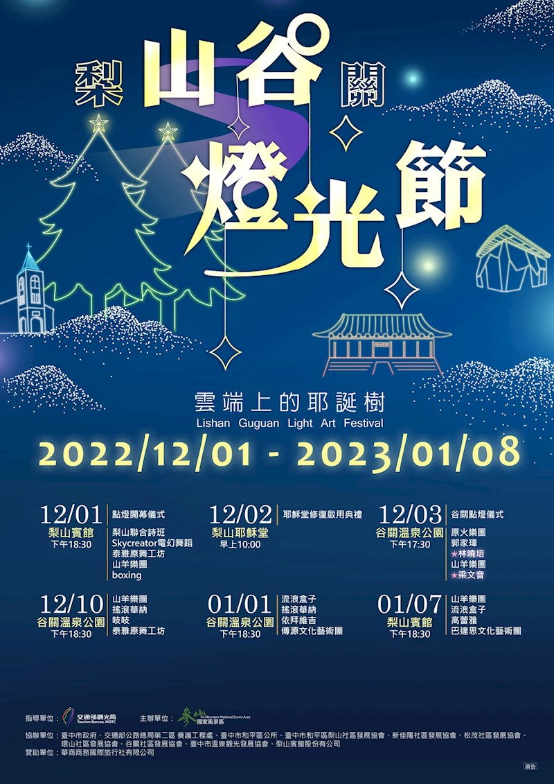 「2022山谷燈光節」將於12/1日~2023/1/8日期間,於梨山、谷關兩地璀璨登場,海拔最高聖誕樹搭上繽紛浪漫的燈飾,點亮山谷,一年一度雲端上的夢幻場景,一定要朝聖打卡。