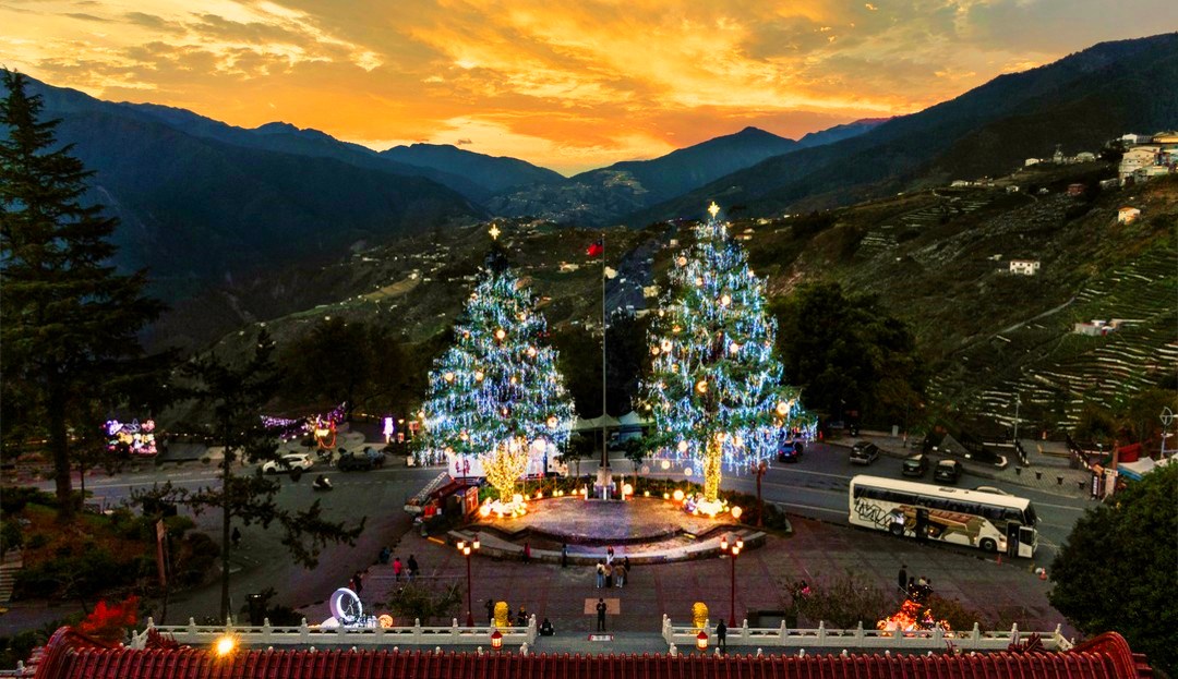 今年「璀璨梨山」為主題,在梨山賓館前打造兩棵高28公尺的大雪松耶誕樹,延伸週邊的街道也都布置起繽紛的LED燈,加上全國最高教堂「梨山耶穌堂」落成,將於12/2日舉辦敲響大鐘儀式,聖誕節期間,梨山耶穌堂將用電腦燈光染色變換色彩,打造夢幻光影,也是今年必看亮點。
