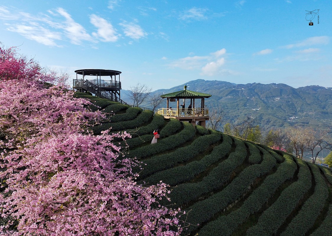 海拔約1000~1300公尺的八卦茶園,享有極佳的地理優勢,天氣好時可以遠眺南投美景,雲霧繚繞時也猶如人間仙境,漫步在茶園中的櫻花步道上,兩側百棵的櫻花綻放枝頭爭奇鬥艷,與翠綠茶樹交織出夢幻美景,令人心曠神怡。