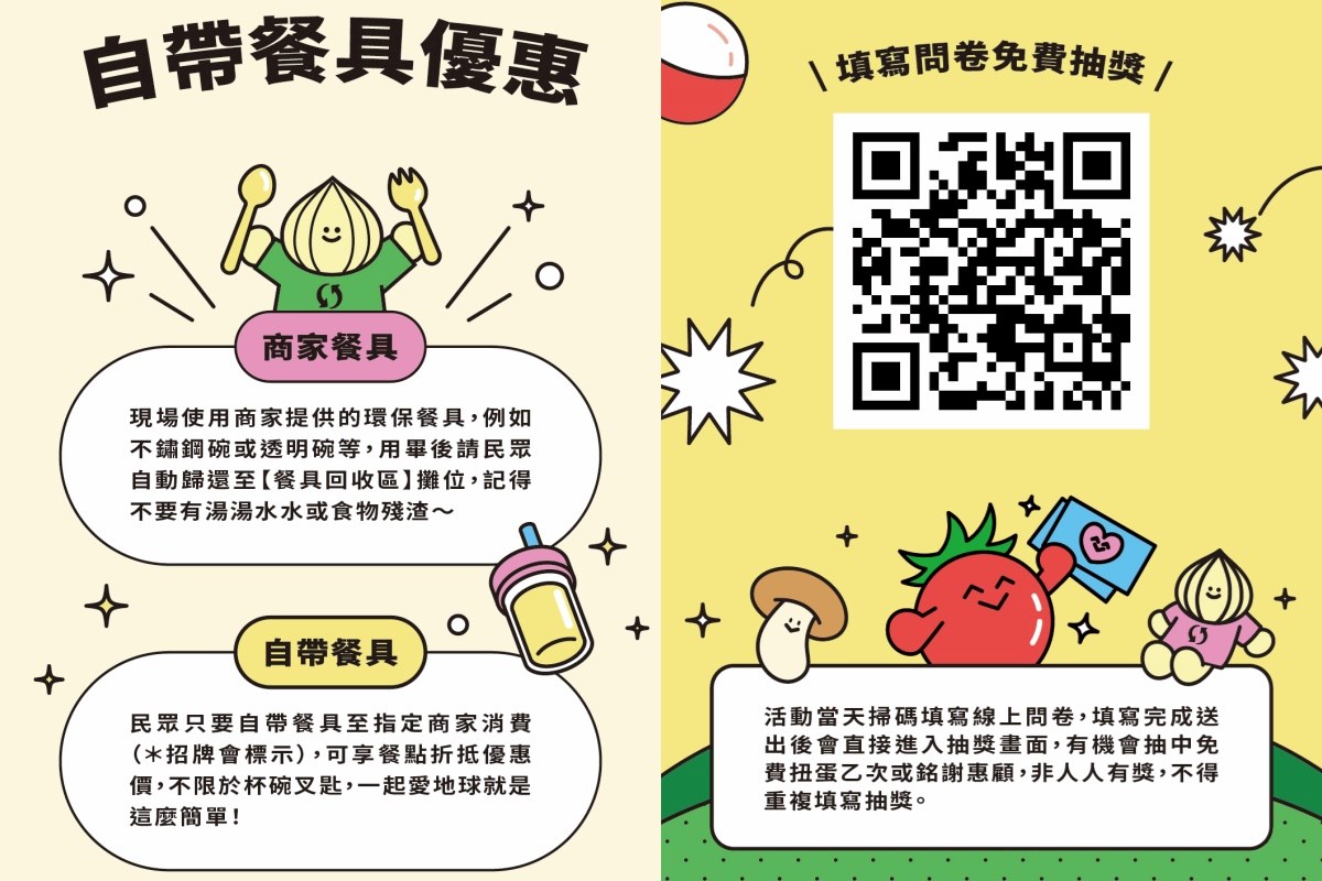 另外,參加者自備餐具,共同愛護地球。在指定攤位消費時,攜帶自有餐具的朋友們可享有餐點優惠,更有驚喜彩蛋,活動當天,只要掃碼填寫線上問卷,就有機會再抽中免費扭蛋一次,快揪團出發逛起來啦!(下方有地址)