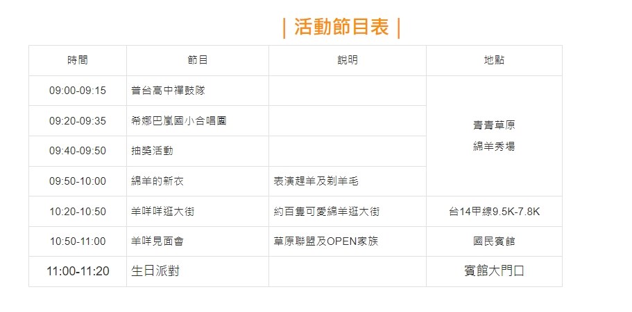 今年以農場特有代表動物「柯莉黛綿羊」為活動主軸,場地在青青草原,除了有表演團體帶來的精采演出,還有本場特有的綿羊新衣秀,集合本場羊隻約百隻,於台14甲線上進行趕羊,體驗羊咩咩逛大街的樂趣。