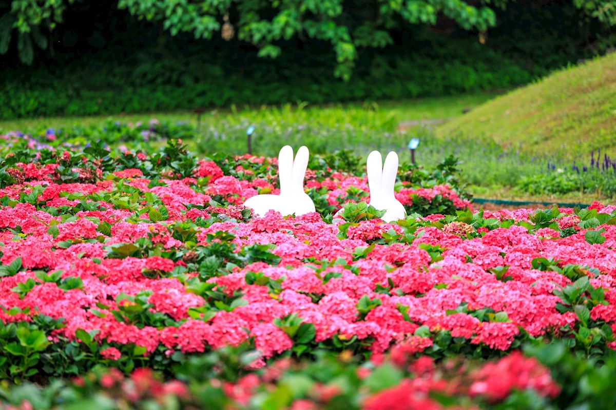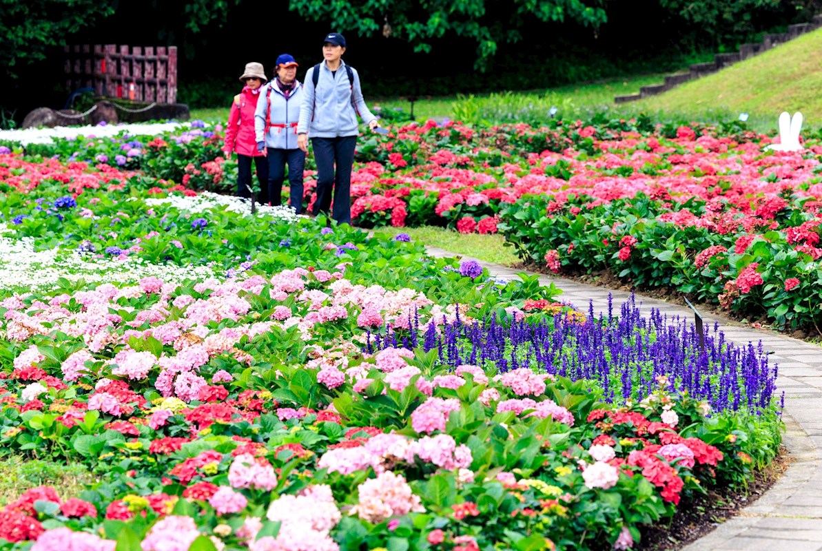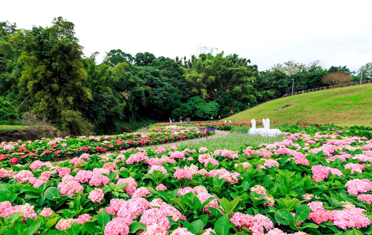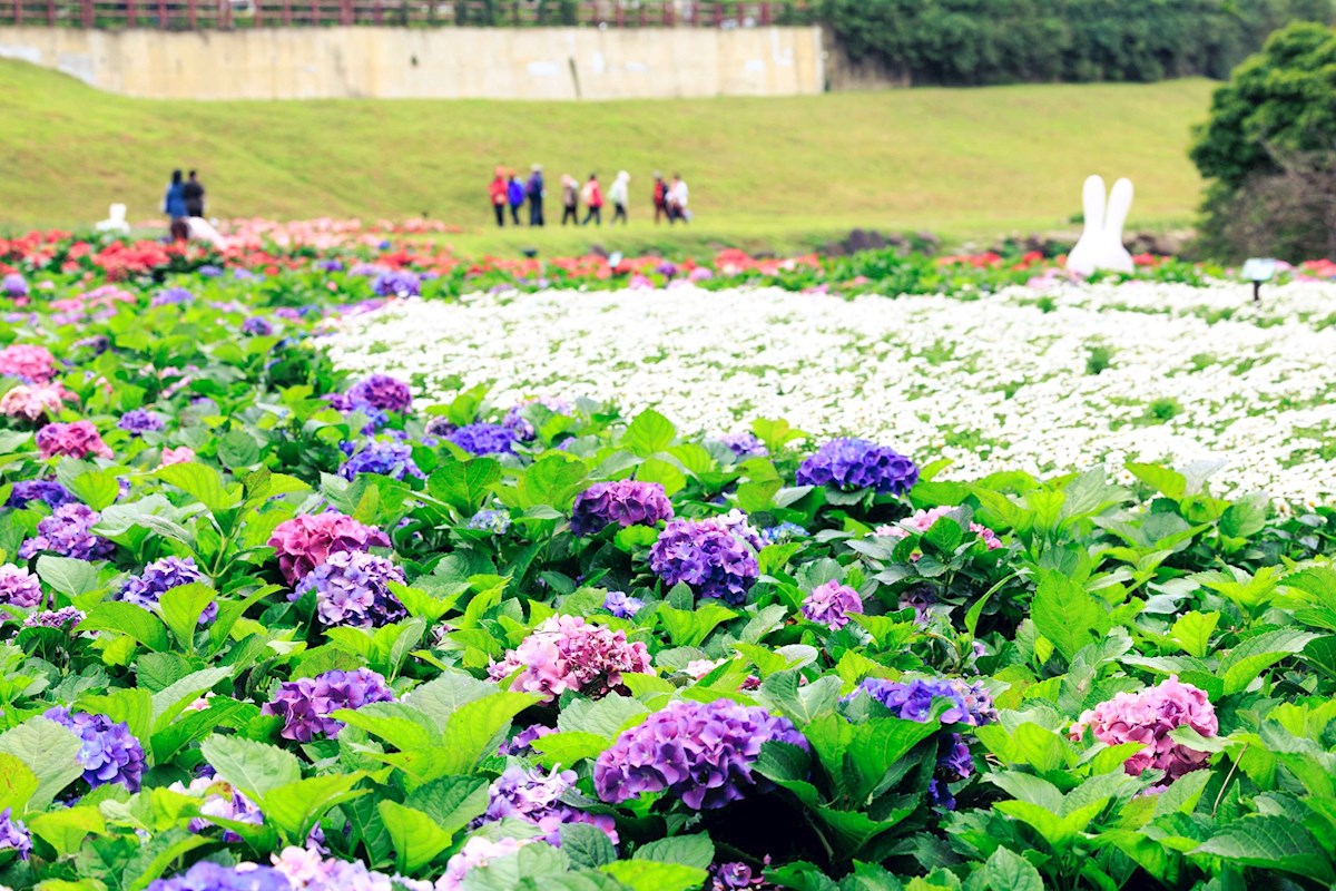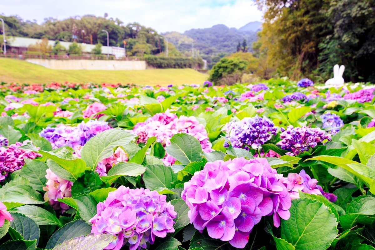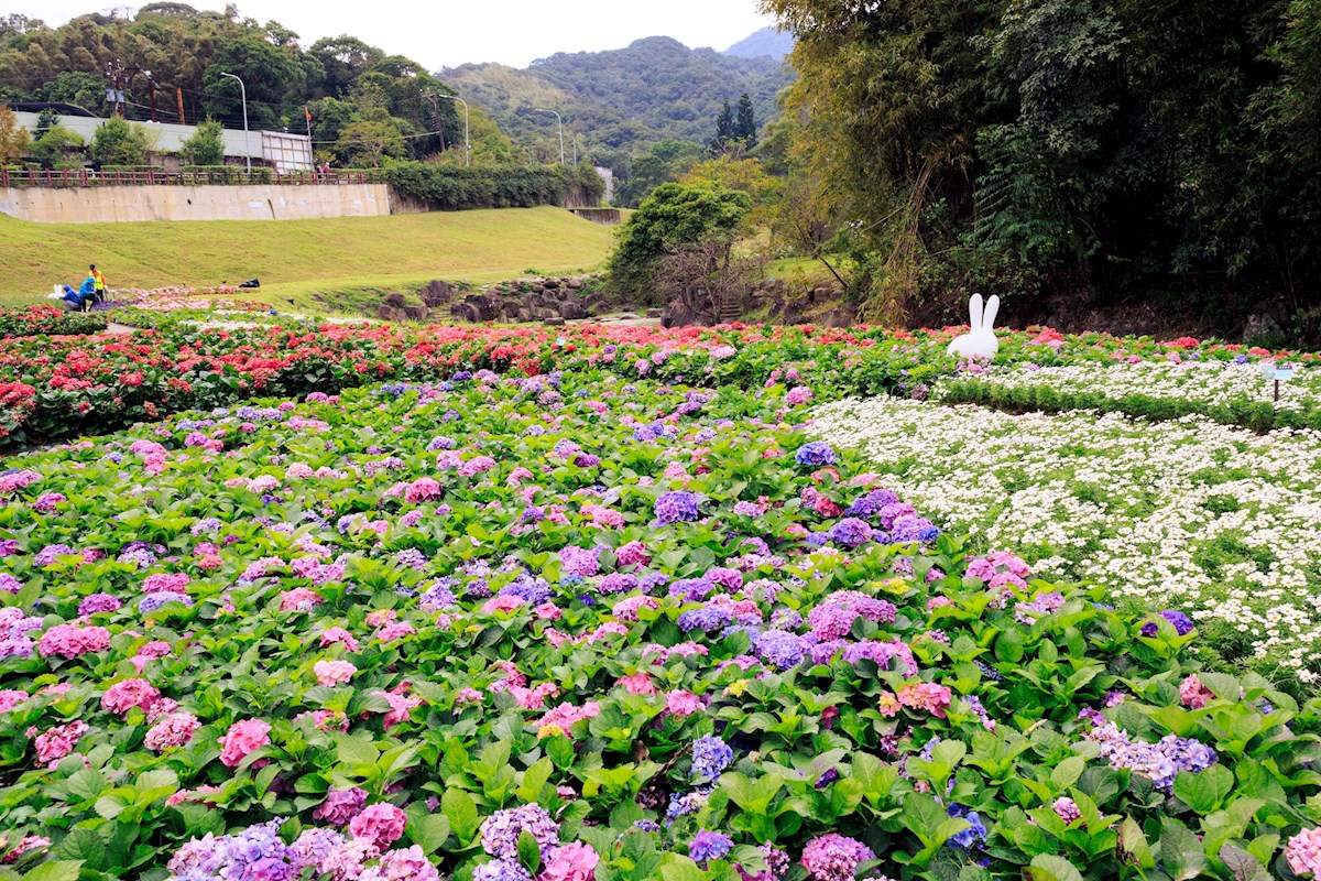 台北內湖「大溝溪生態治水園區」上萬盆繡球花海夢幻綻放,形成美麗花毯,還有超可愛的兔兔造景,拍照起來超級可愛,粉絲們可以準備出發賞花拍美照。