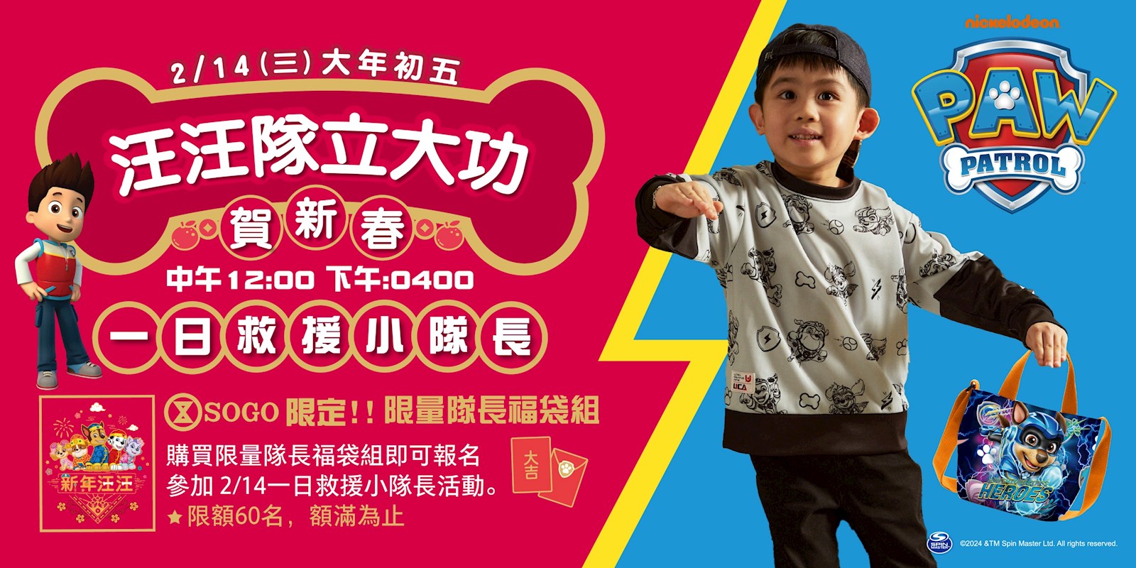 5. 2/14(三)一日救援小隊長:購買12樓汪汪隊快閃店限量隊長福袋組,即可報名參加! *限 3-6 歲小朋友報名參加,需家長陪同