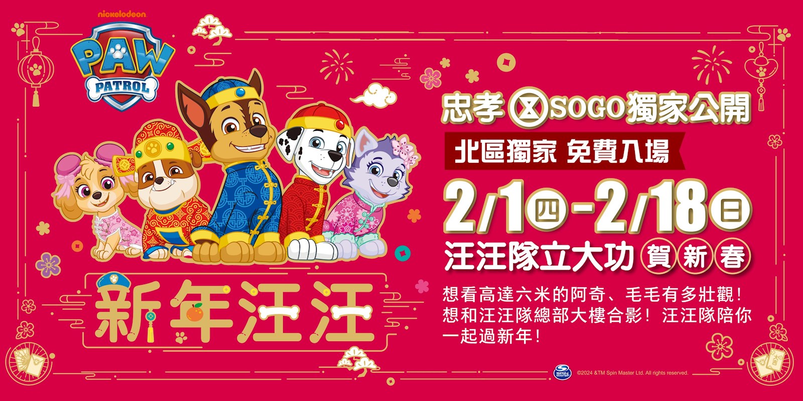 這回於2/1~2/18在台北市忠孝SOGO百貨12F登場的汪汪隊特別場,現場佈滿濃濃的龍年造景及新年角色吊旗,還有超吸睛的汪汪隊入口拍照區!這次汪汪隊成員們全部穿上龍年新衣邀請你們一起來跟他們出發救援任務,再來旁邊就是與卡通1:1擬真還原的總部大樓,並有4位高人氣角色陪你盡情拍照上傳。