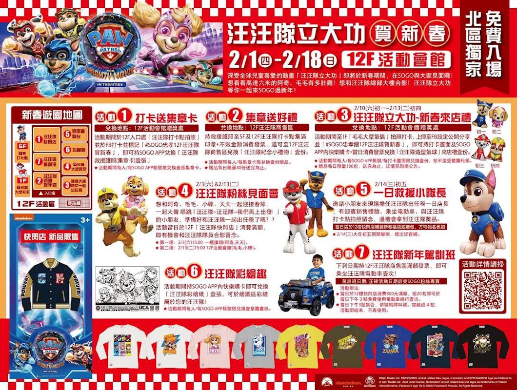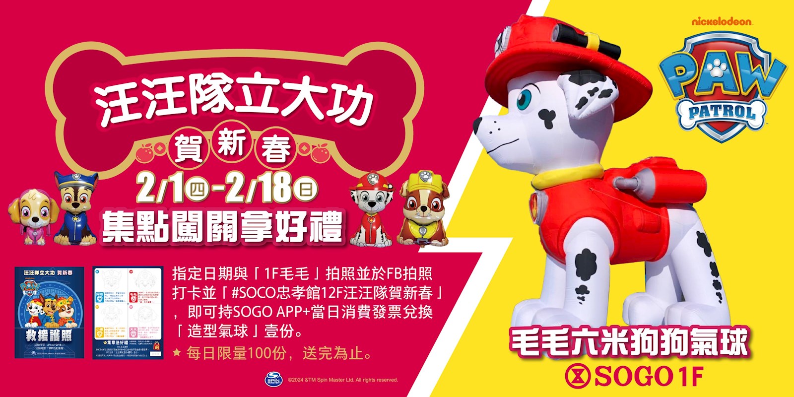 2. 汪汪隊新春來店禮:只要FB打卡+下載SOGO APP+忠孝館當日12F發票,可兌換汪汪隊造型氣球一個 (每日限量100個)