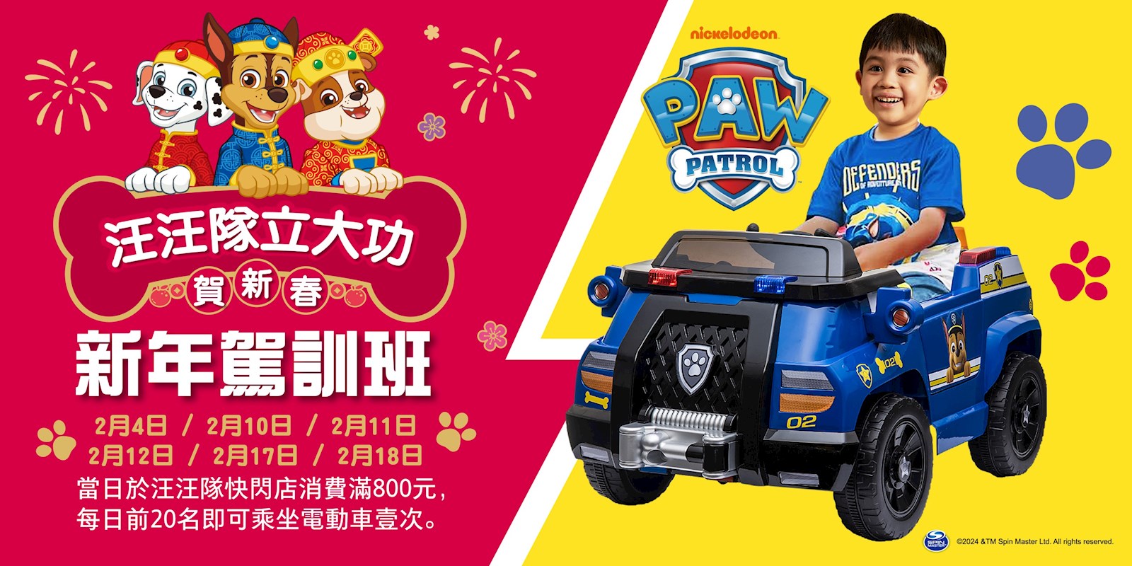 6. 2/4(日)、2/10(六)~2/12(一)、2/17(六)~2/18(日)新年駕訓班:於12樓汪汪隊快閃店消費800元,前20名即可於指定時間乘坐汪汪隊電動車
