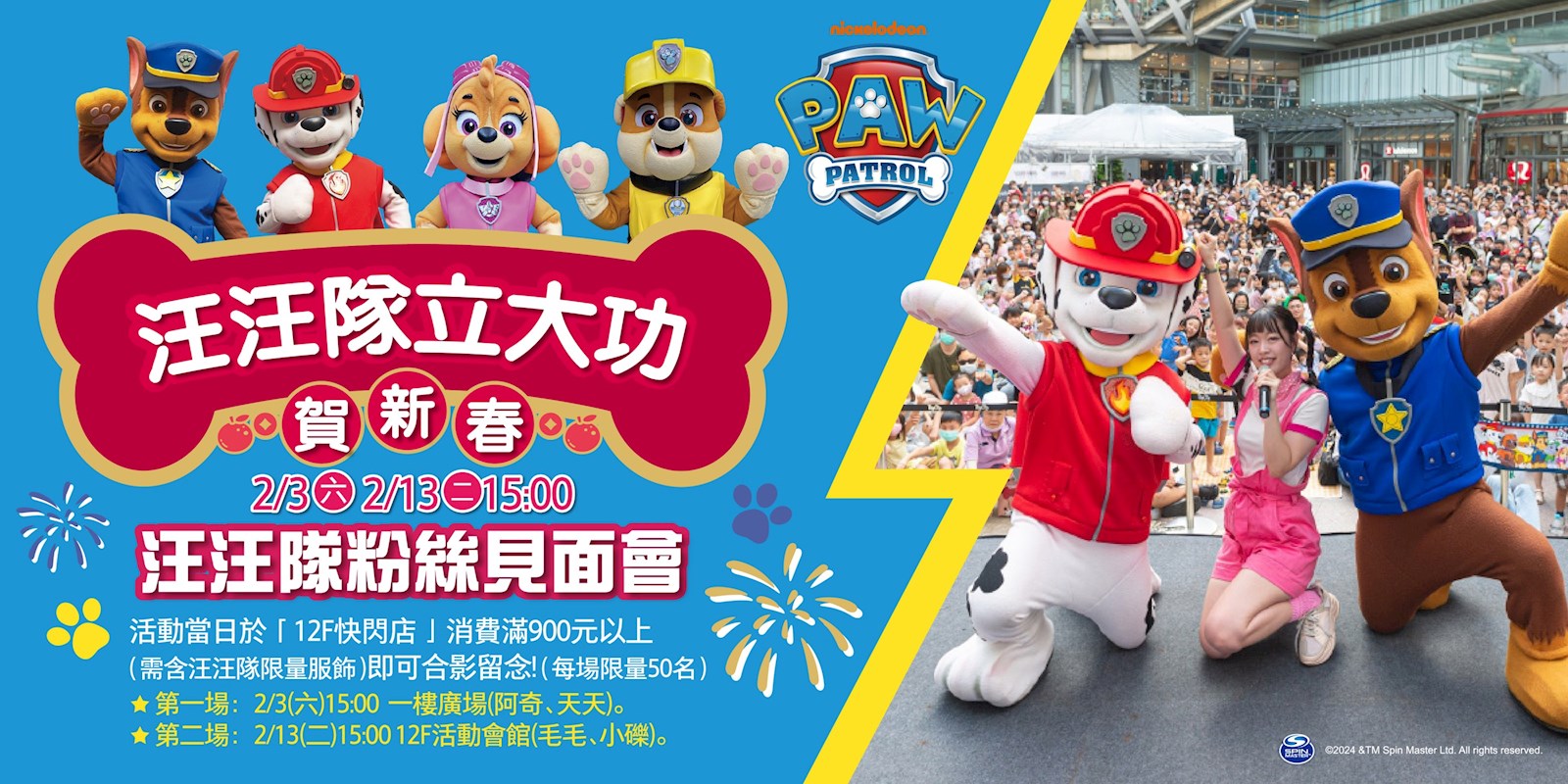 1. 汪汪隊粉絲見面會-第一場:2/3(六)15:00 一樓廣場(阿奇、天天)、第二場:2/13(二)15:00 12F 活動會館(毛毛、小礫)