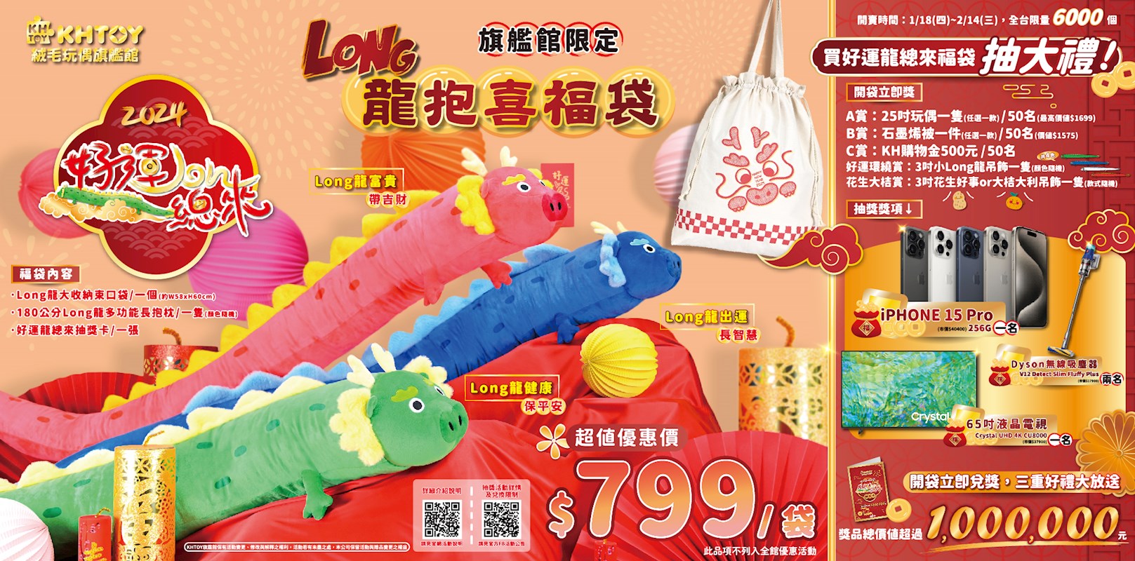 超大隻長達 180cm 的超可愛長龍抱枕,還有一張好運抽獎卡,有機會立刻加碼獲得 25 吋大玩偶、石墨烯被與購物金;還能登錄抽 IPhone 15 PRO 、 65 吋大電視、 dyson 吸塵器,獎品總價值超過 1,000,000 元!福袋中的好運龍抱枕顏色分為紅、綠、藍,分別代表龍富貴、龍健康、龍出運,三色隨機,為大家祈求龍年好運,一定要手刀帶回家。