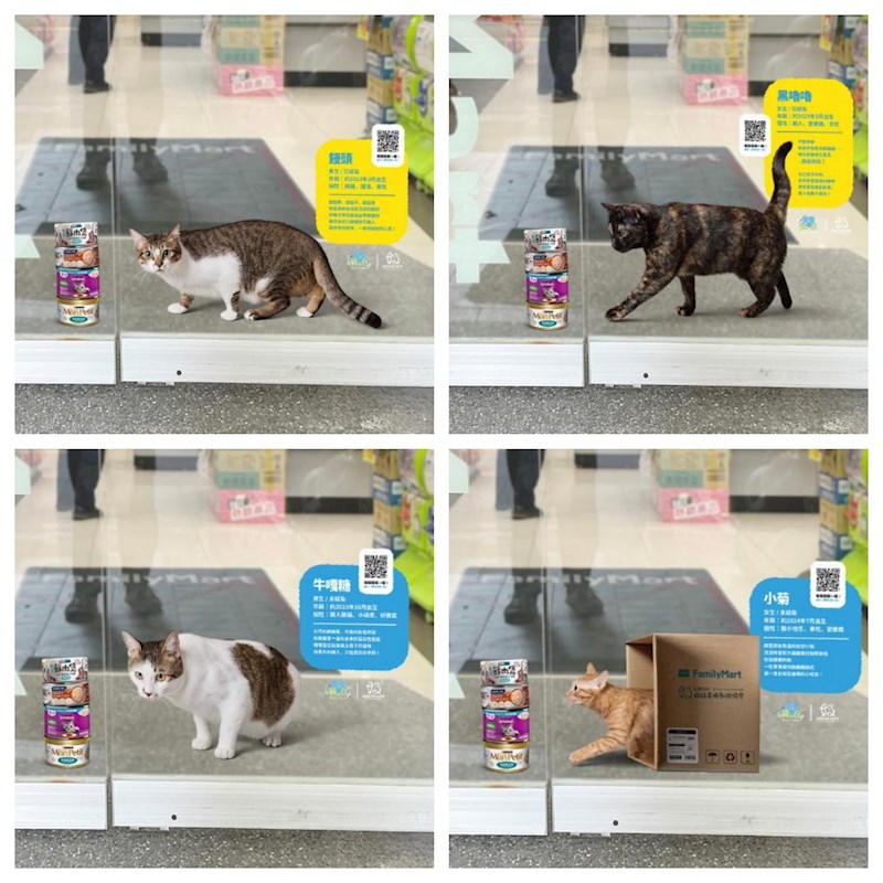 全家別出心裁地將電動門上貼上浪貓的故事與QR Code,讓路過的人可以了解並參與認養行動,萌力四射的同時,也能為流浪貓出一份心力!