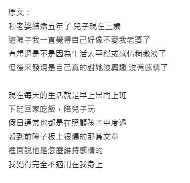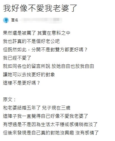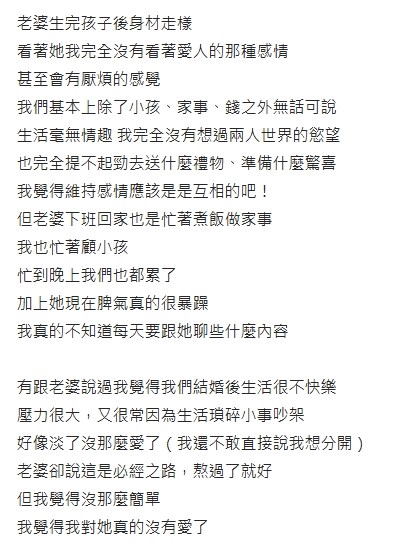 日前一名人夫在Dcard發文直言「我好像不愛我老婆了」,透露自己和老婆結婚5年,兒子已經3歲,但這陣子卻覺得自己好像已經不愛老婆了,對她已經沒有感情了,「老婆生完孩子後身材走樣,看著她我完全沒有看著愛人的那種感情,甚至會有厭煩的感覺」,與老婆除了小孩、家事和錢外,基本上無話可說,生活也沒有任何情趣,完全沒有想過兩人世界的慾望,原po認為感情應該要互相,但如今老婆下班忙著煮飯做家事,而他忙著照顧小孩。