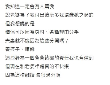 忙到晚上兩個人都累了,加上老婆現在的脾氣越來越暴躁,真的不知道該跟老婆聊什麼話題,「我知道一定會有人罵我,說老婆為了我付出這麼多我還嫌她之類的,但我想說的是,情侶可以因為身材、各種理由分手,夫妻就不能因為這些分開嗎?」,原po說養孩子、賺錢這些身為一個爸爸該盡的責任他也都有做到,但他現在跟老婆相處真的很不快樂,所以發文詢問網友「因為這樣離婚會很過分嗎?」