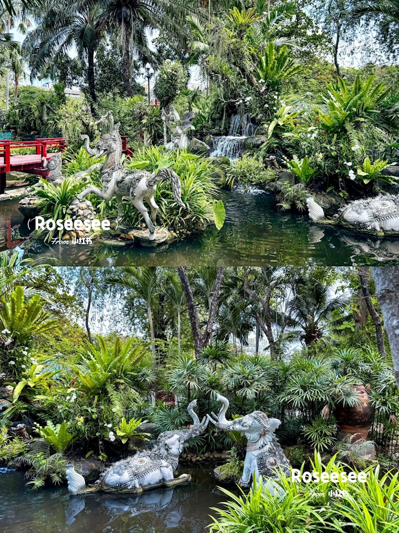 館外圍被巨型圓形蓮花池包圍,水光與粉紅色建築互相映襯,氛圍超級浪漫。步道兩側排列著各式大象雕像,每一隻大象都裝飾獨特,有的還有泰國傳統花環,是最有趣的戶外美拍區。草坪花園景觀維護得很用心,適合散步、野餐、發呆,一不小心就能在一堆雕塑間捕捉到超可愛的合影。