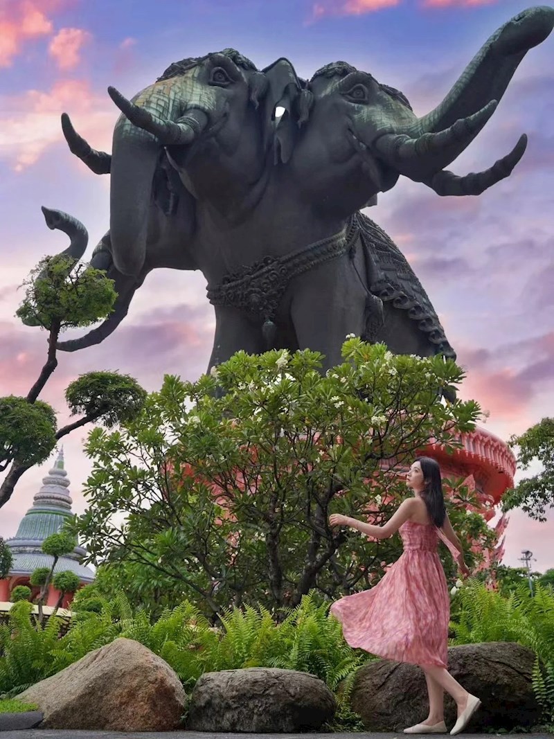 舉頭一望,三頭巨象「Erawan」高達29公尺,長39公尺,全體以青銅鑄造,氣勢磅礡讓人不自覺驚歎!巨象盤據粉紅色基座,如同站在神話入口,是整個園區的鎮館之寶與IG必拍NO.1。