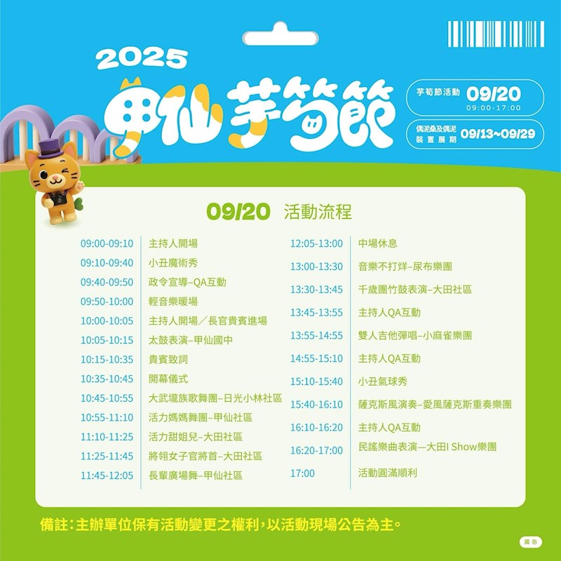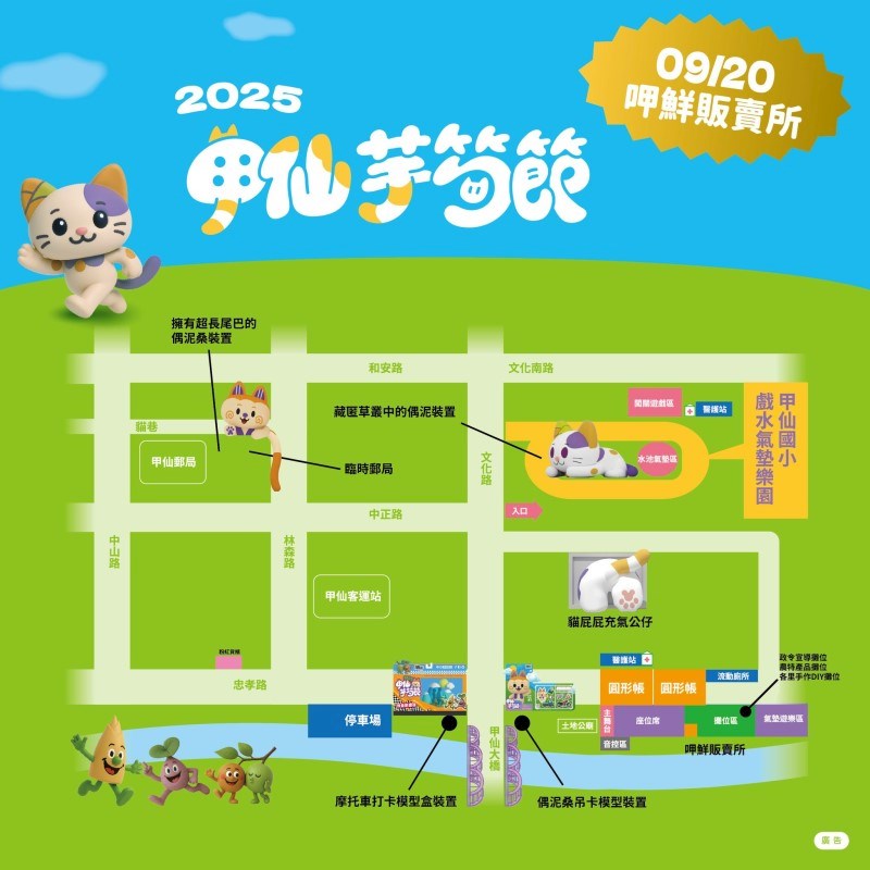 一年一度「2025甲仙芋筍節」將於9月20日(六)熱鬧開跑!超萌「偶泥」系列的五大裝置藝術遍佈甲仙,DIY手作體驗、闖關遊戲、精彩舞台表演和大型氣墊遊樂區,讓大人小孩都玩得盡興,還有在地芋頭與竹筍的創意美食,來甲仙一定要玩好玩滿!
