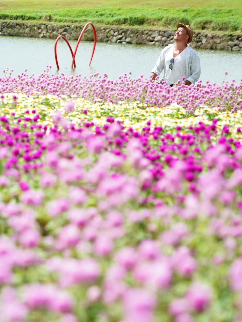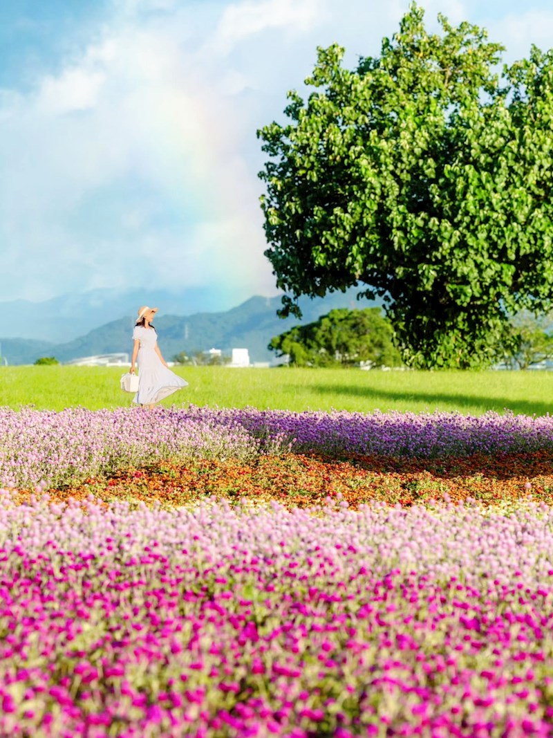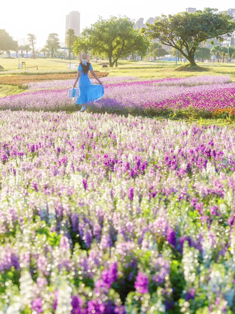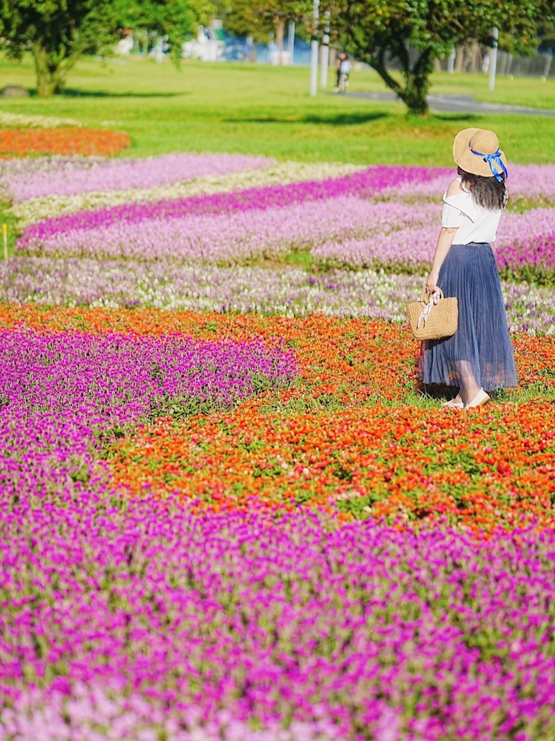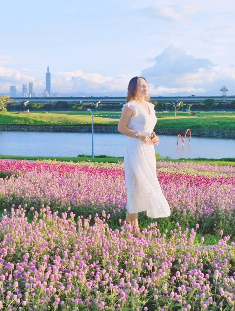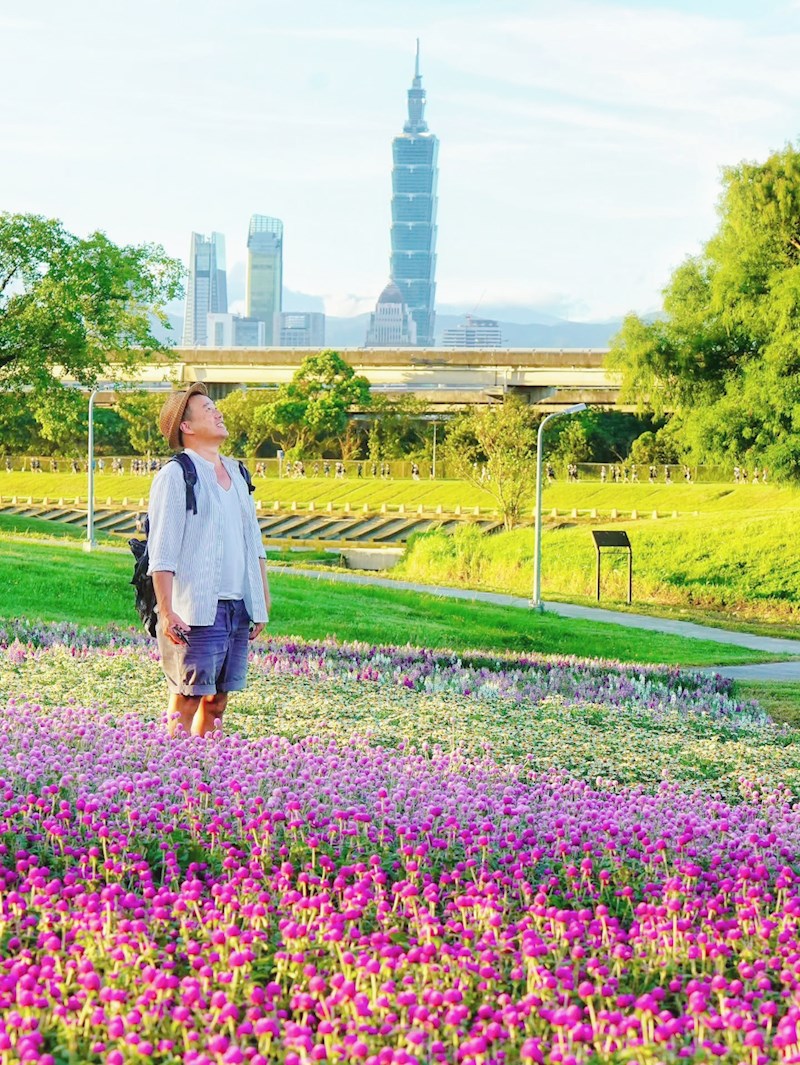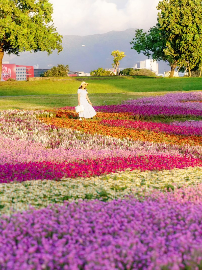 台北「美堤河濱公園」旁自然親水灣的野花系特色花海浪漫登場!種滿了超過4萬盆夢幻草花,包括療癒感的千日紅(圓仔花)、粉嫩可愛的天使花和繽紛的小百日草,各色花叢高低錯落,彷彿走進一幅繽紛又自然的野花畫卷,美不勝收!