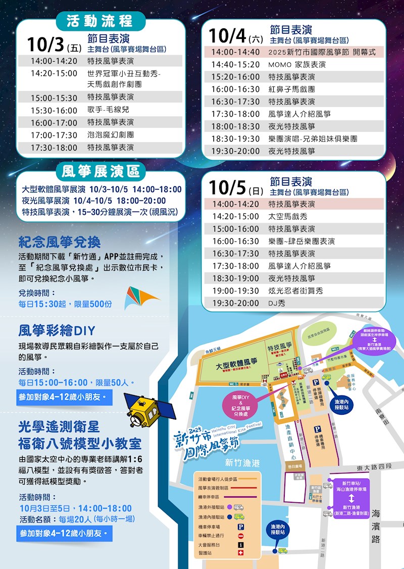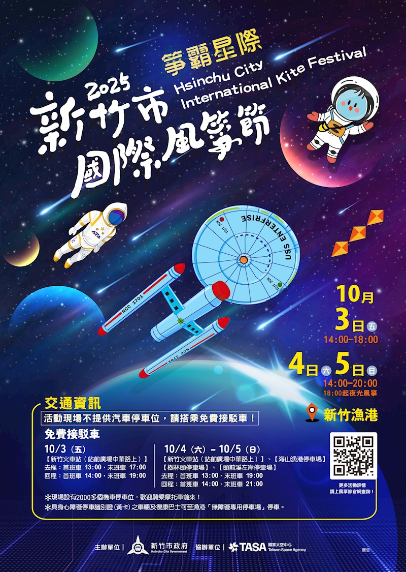 「2025新竹市國際風箏節」於10/3至10/5在新竹漁港華麗登場!今年主題是超酷的「箏霸星際」,結合了科技與太空元素,邀請來自法國、義大利、紐西蘭、新加坡等國際頂尖團隊,以及台灣各地的優秀風箏高手,共同打造全台最大最震撼的空中盛會!