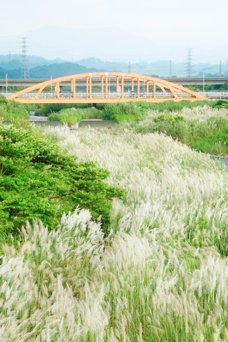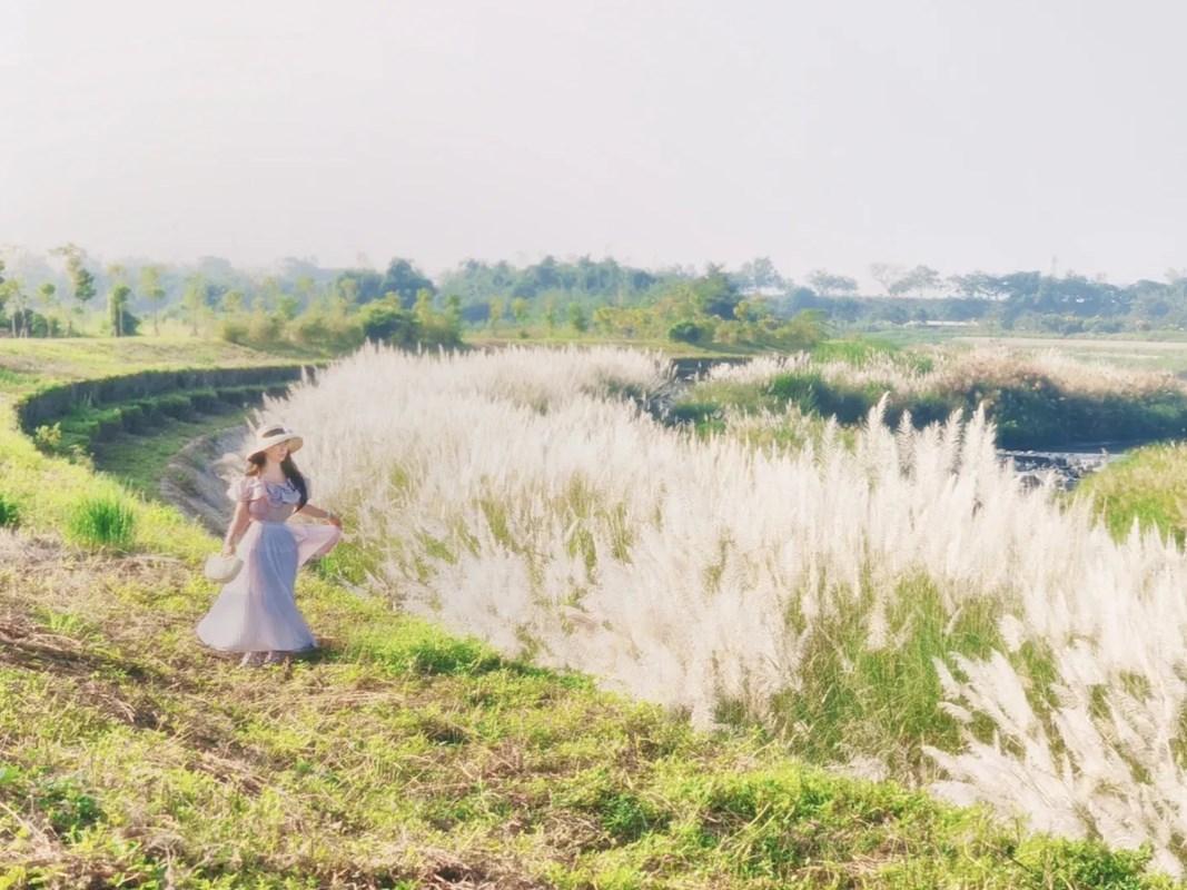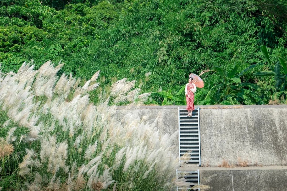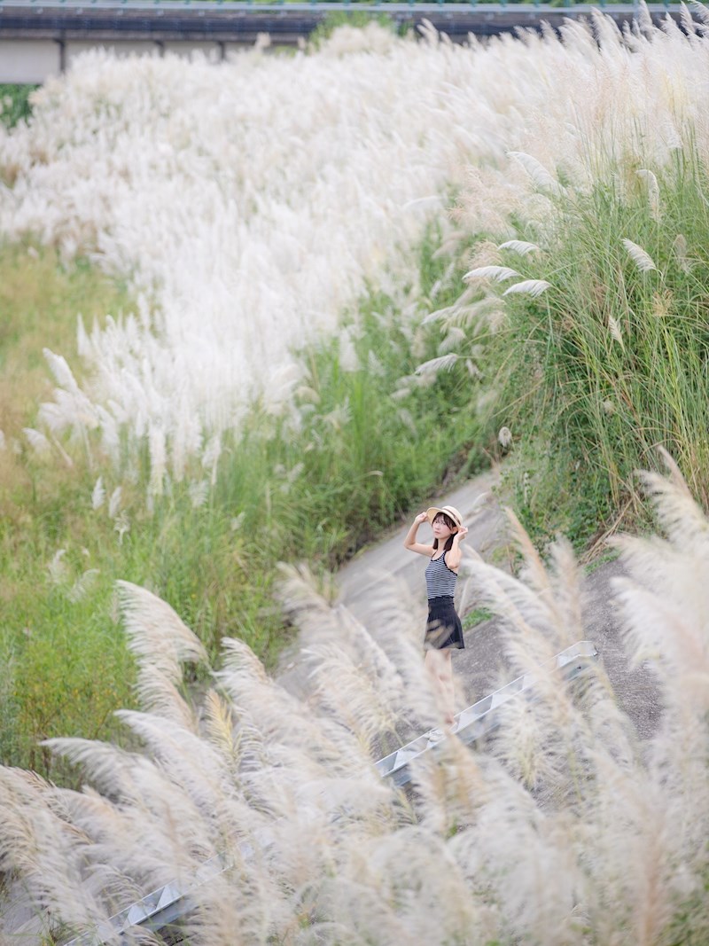 這片甜根子草秘境的魅力,不僅在於大片銀白花海,還有堤防的地形起伏製造出豐富的視覺層次。站在不同的位置,都可以捕捉到如波浪般層疊起伏、變幻無窮的神奇景象。搭配周遭的綠意,能遠望到翠綠映著銀白,營造出一種仙氣滿滿的氛圍。
