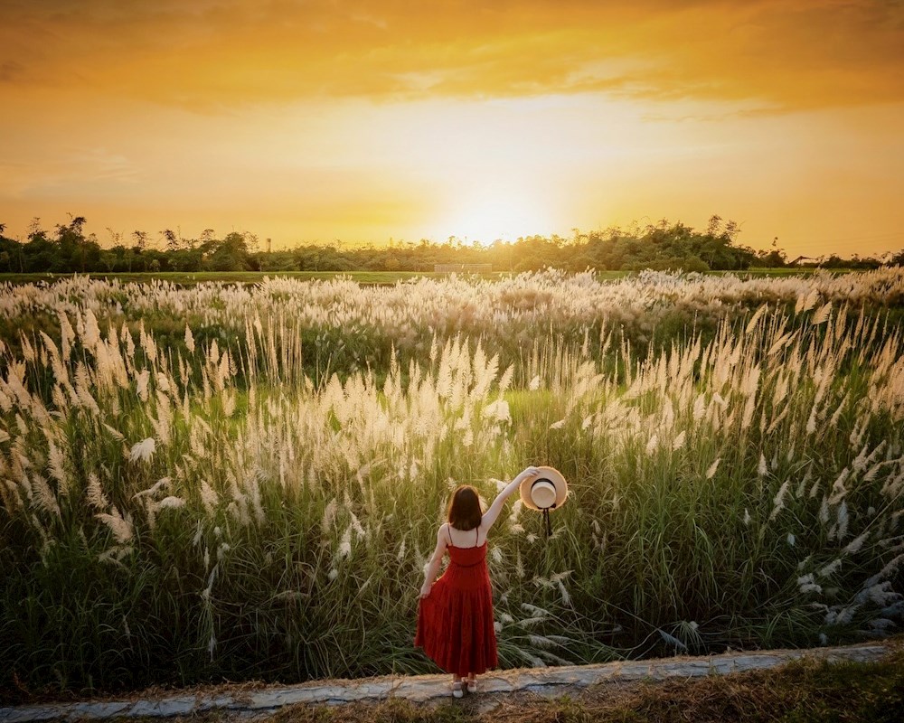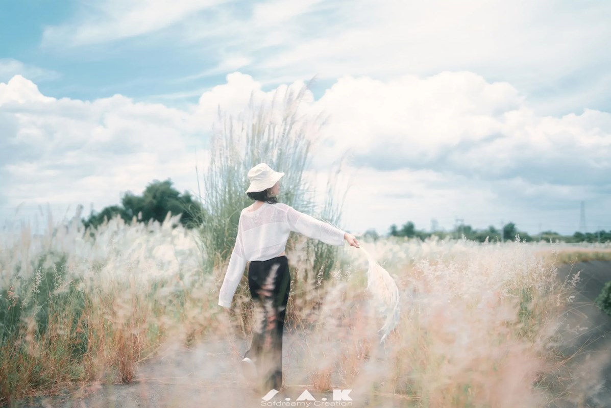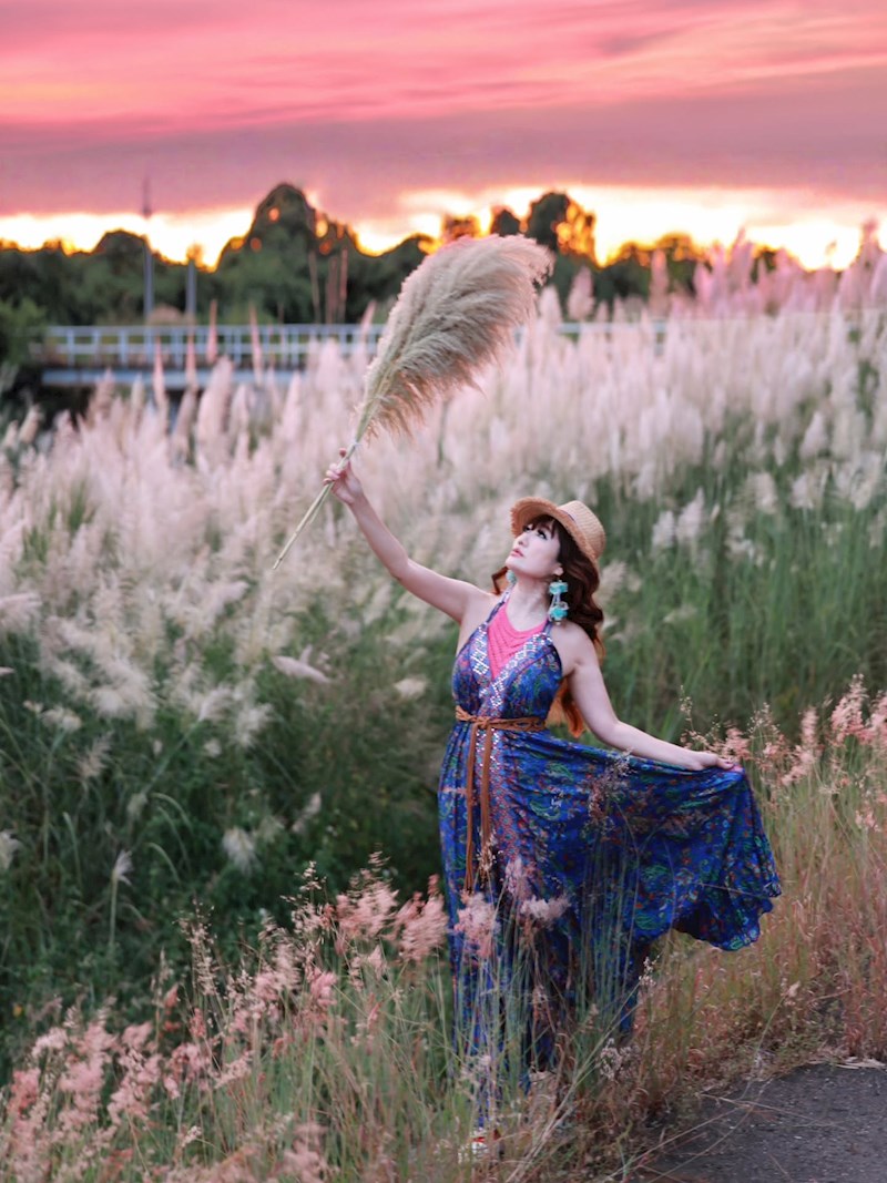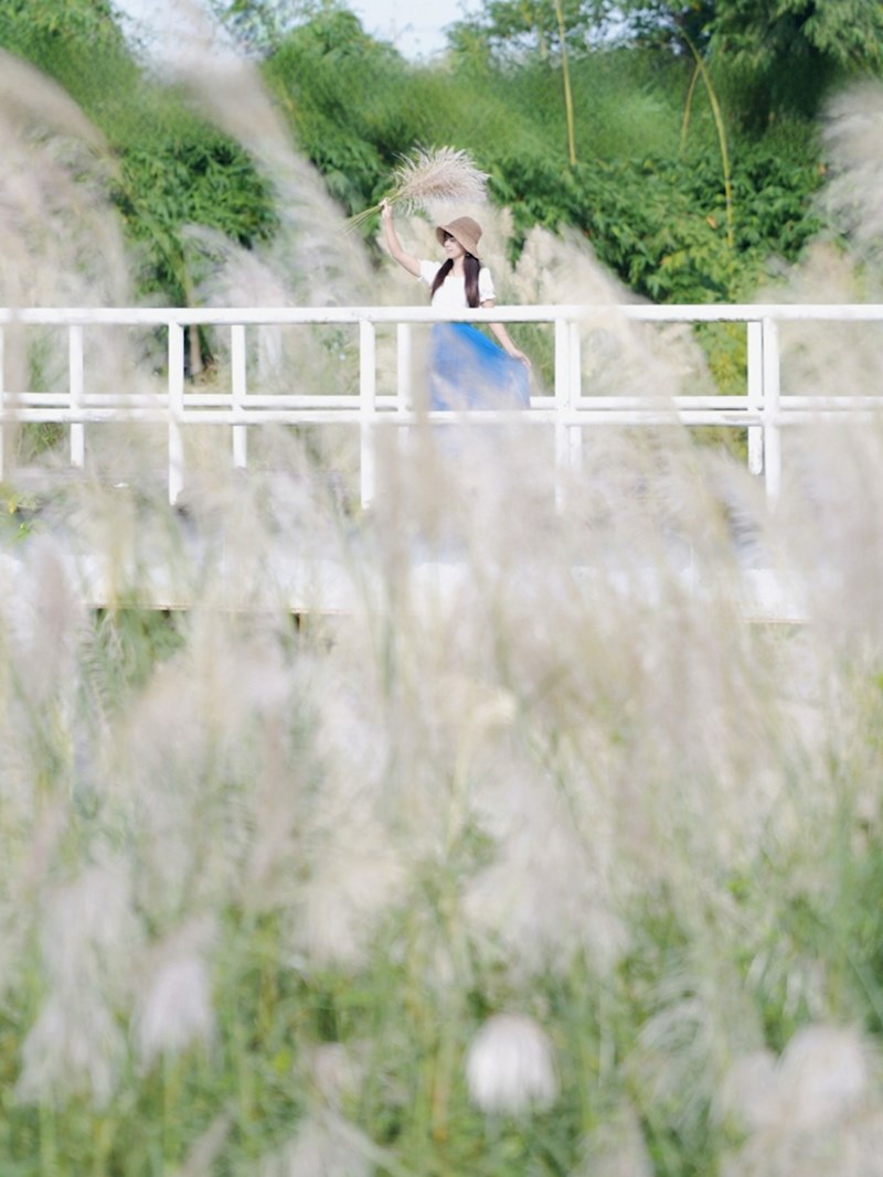 這片甜根子草秘境的魅力,不僅在於大片銀白花海,還有堤防的地形起伏製造出豐富的視覺層次。站在不同的位置,都可以捕捉到如波浪般層疊起伏、變幻無窮的神奇景象。搭配周遭的綠意,能遠望到翠綠映著銀白,營造出一種仙氣滿滿的氛圍。