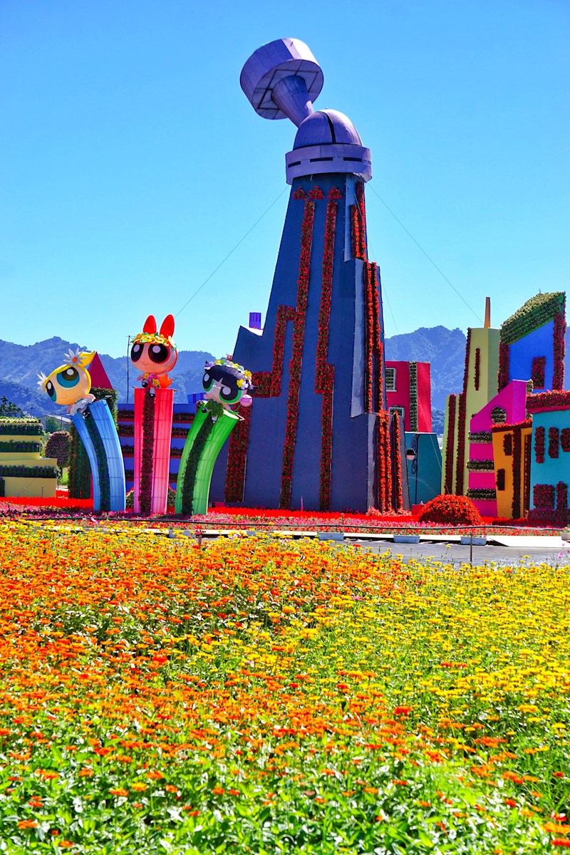 今年花毯節以超人氣《飛天小女警》為主題,各種動畫場景化身花卉裝置,像是盪鞦韆、甜甜圈店,趣味十足。主花毯高達18米,直徑60米,還會每半小時展演一次結合水霧和機械效果的精彩表演,彷彿帶你進入一個奇幻的花花世界。