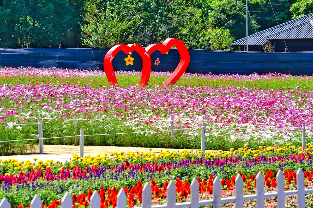除了主題花毯,新社花海佔地超過29公頃,花種豐富多樣,從一串紅到波斯菊,綿延成一幅幅絢麗的色彩畫布,還能看到波斯菊花海與金色稻浪自然相襯,是拍攝婚紗、親子旅遊、好友打卡的超棒場景。這次還首次開放婚紗拍攝入園,讓準新人在花海與山景中留下最浪漫的回憶。
