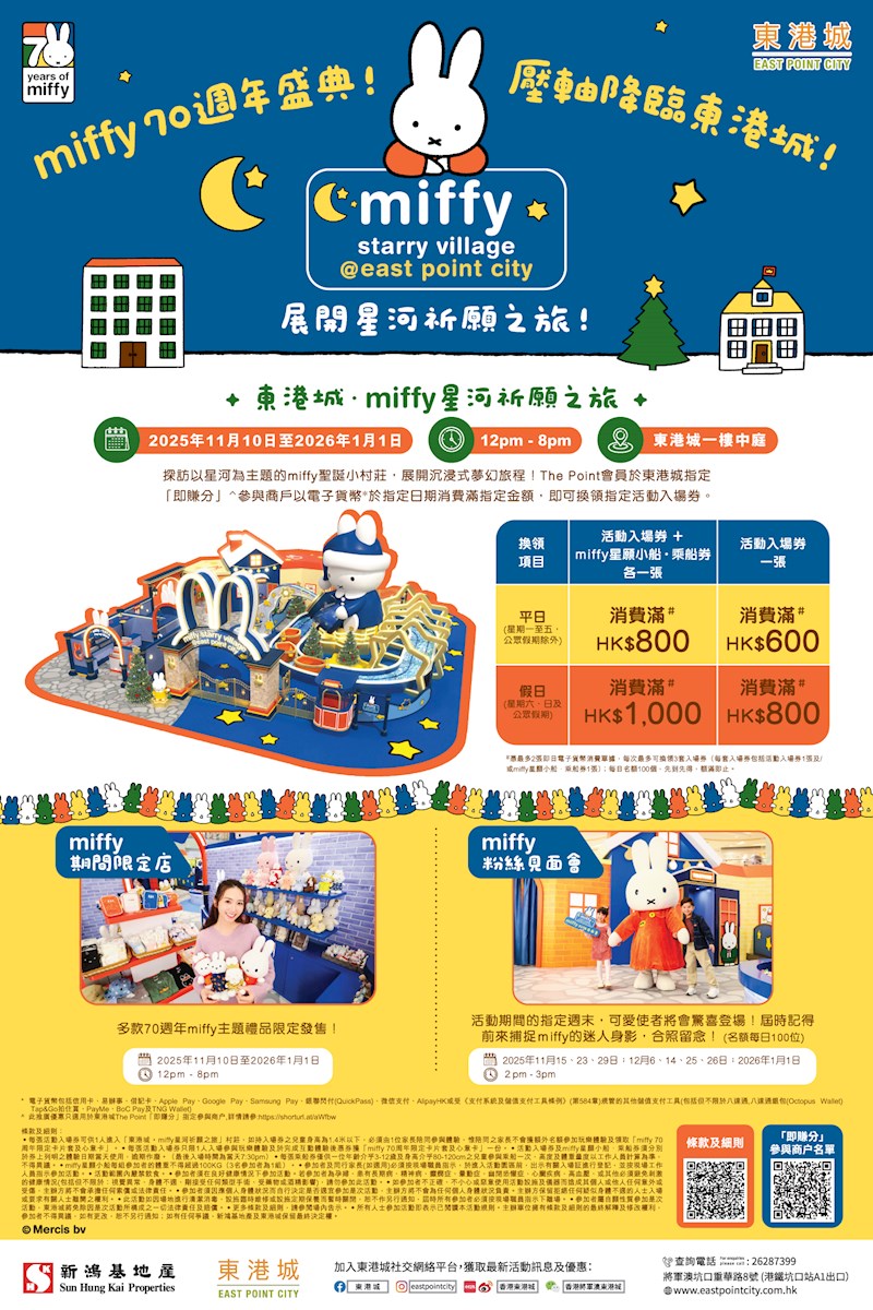 2025年冬天,喜迎Miffy 70歲生日,香港將軍澳東港城變身成一座唯美浪漫的星河祈願小鎮,帶來超萌又夢幻的「東港城 X Miffy 星河祈願之旅」!從即日起到明年1/1,邀請粉絲一同來穿越星河,許下暖心願望,感受滿滿幸福能量!