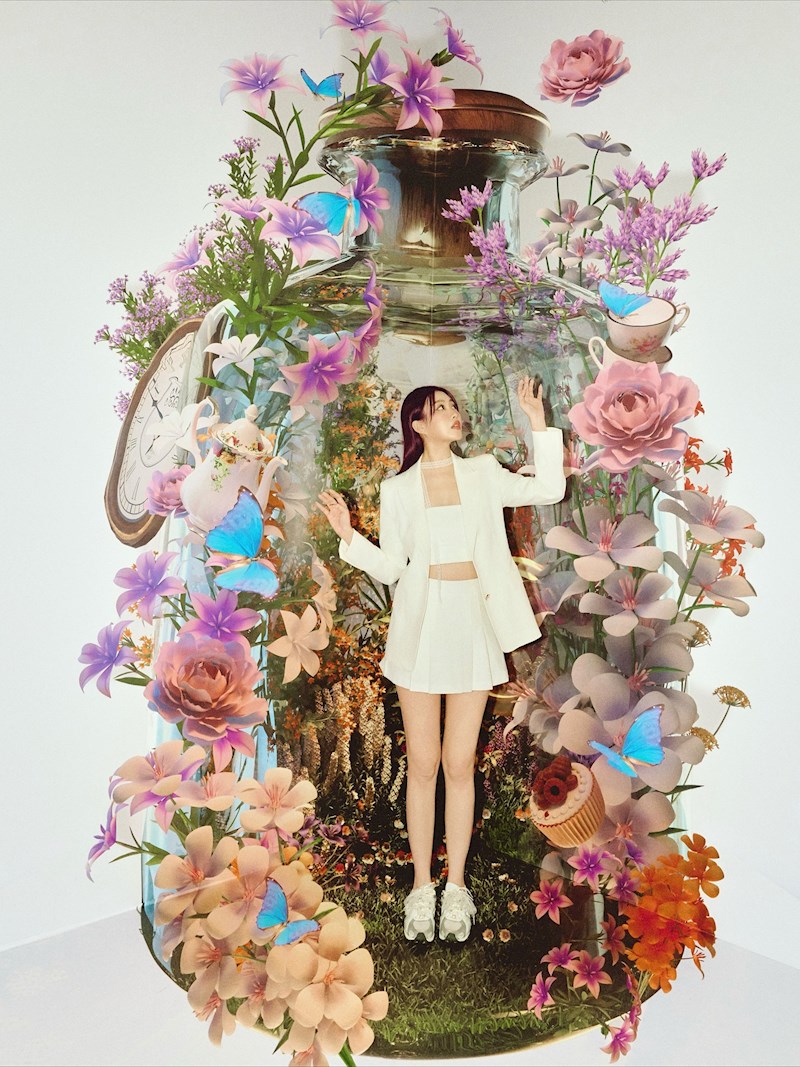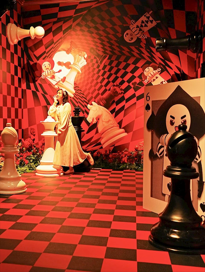 展場中結合AI互動與最新燈光投影技術,與清透花果香、紫羅蘭粉香及溫潤木質香3款香氛主調設計,讓觀眾在視覺、聽覺、嗅覺甚至觸覺上都能沉浸在愛麗絲的奇幻世界中。