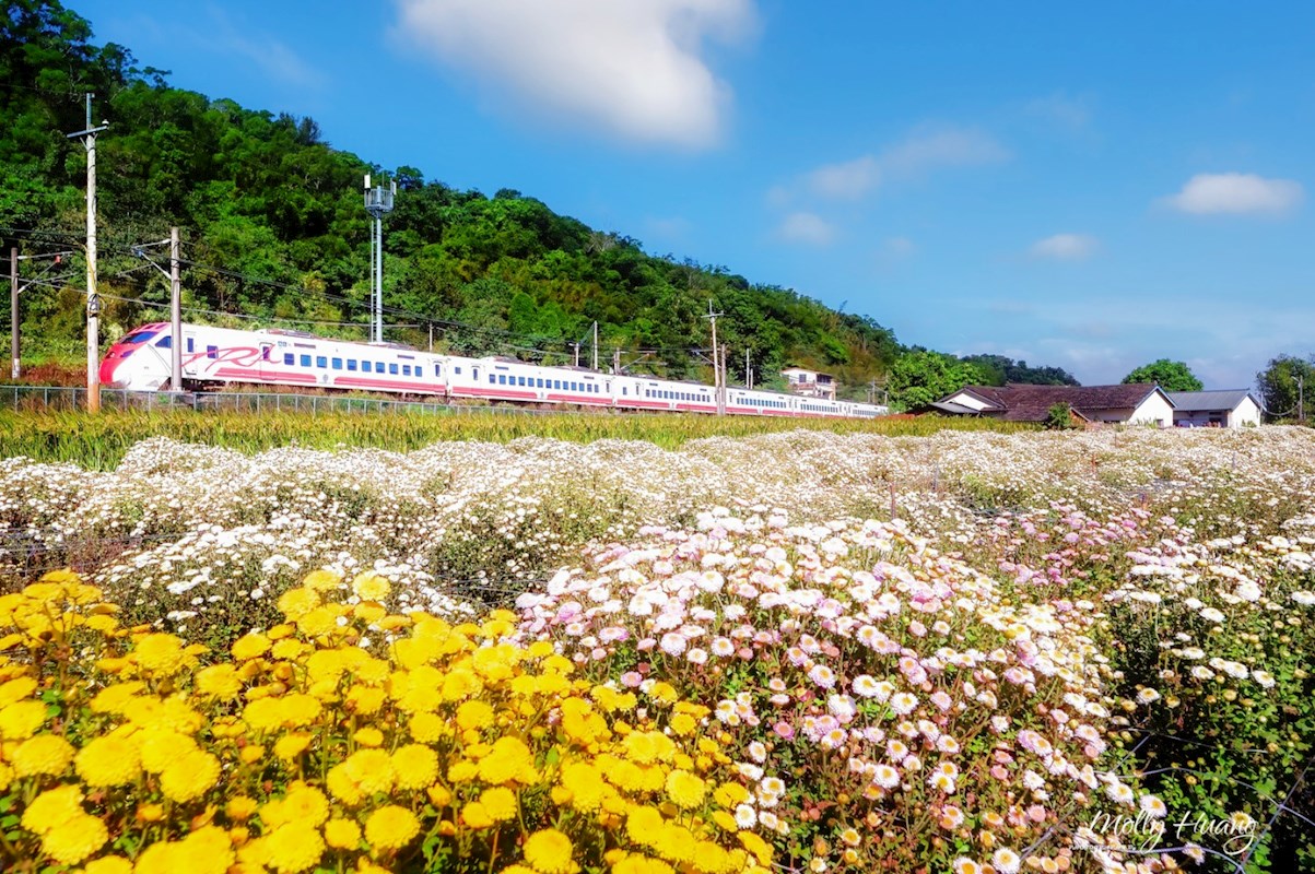 銅鑼鄉是台灣最大杭菊產地,杭菊花田遍布九湖村、朝陽村及樟樹村等多處,金黃色與純淨白色花朵鋪滿整個山坡,層層堆疊如一條金色花毯,隨風搖曳,令人心醉。活動主場設於融樂牙刷觀光工廠對面,不僅能欣賞壯麗花海,還能捕捉火車穿梭其間的經典畫面,絕對是攝影愛好者最愛的必拍勝地。