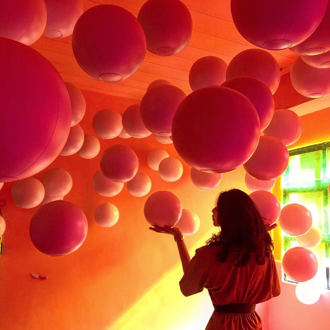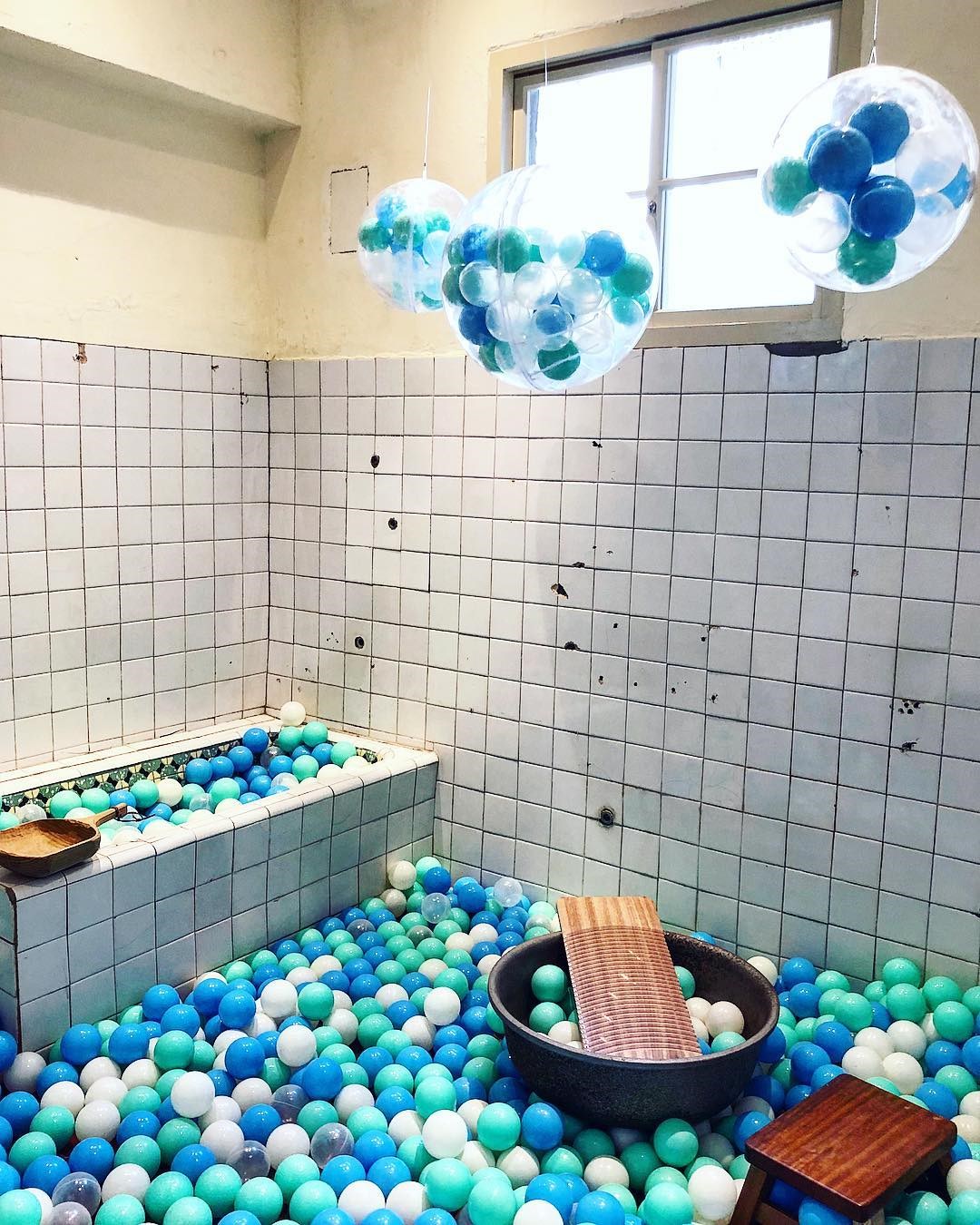 ▲用復古澡堂打造成球池,藍白色的球就像是洗澡時的泡泡,洗衣板跟大鋼盆也讓人瞬間掉入回憶漩渦