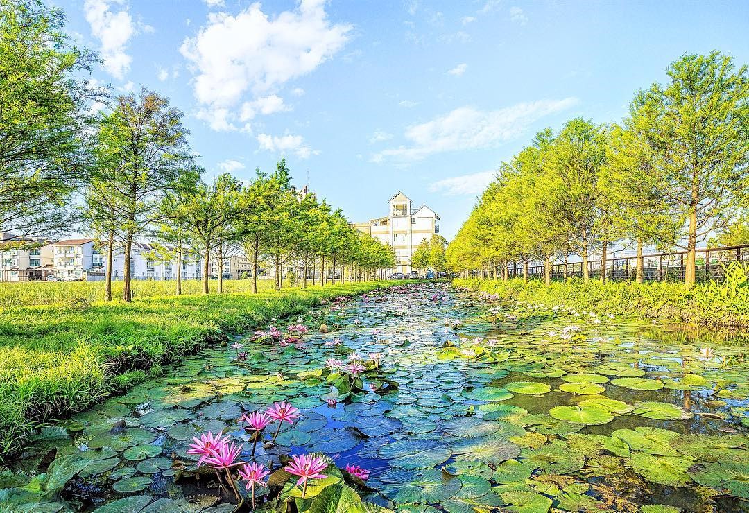 ▲蒼翠的落羽松與蓮花荷葉遍部的景緻,猶如世外桃源